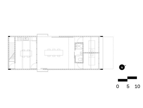 Notes: Central to this project is its emphatic internal focus. Solid perimeter walls suggest an infill site, and the project’s primary element—a highly visible, nearly monumental two-story light well topping a kitchen and living space—foregrounds the creation of interior effects. All project growth is to occur within the limits of these perimeter walls, either through the reprogramming of interior spaces or the addition of second-story enclosures.