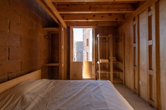 Notes: The primary elements of this project are the volumetric, roomlike rectangular modules central to its organization. Constructed in vernacular adobe blocks and CMU that allow for simple, affordable, and expedient growth in all directions, the house has no clear front. Abundant floor-to ceiling doors afford a porous connection to surrounding landscape and neighboring homes.