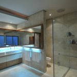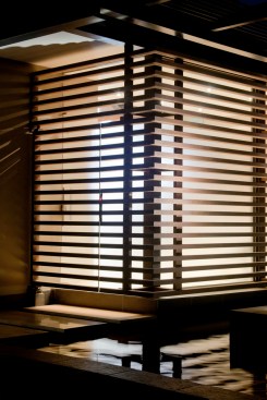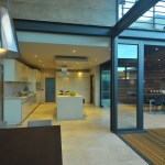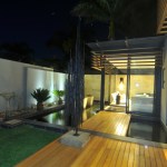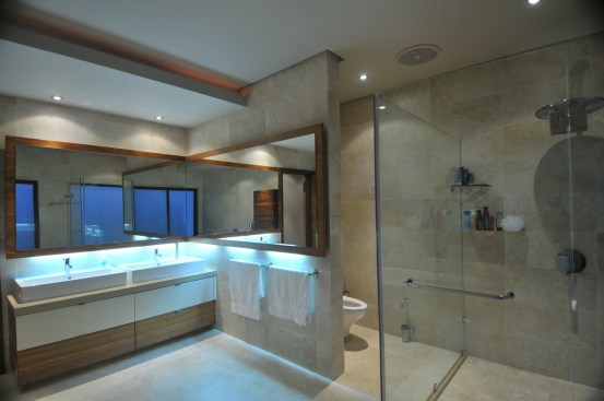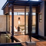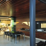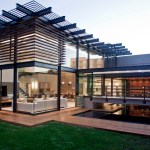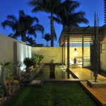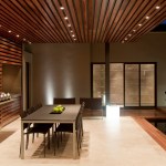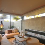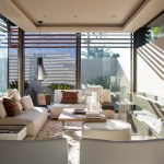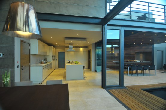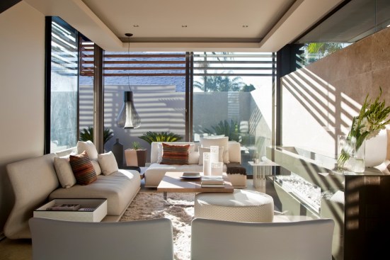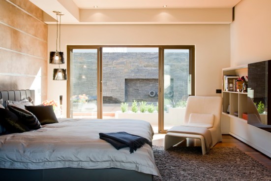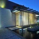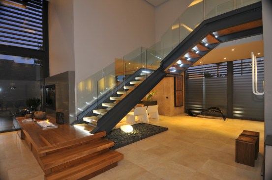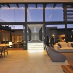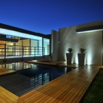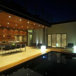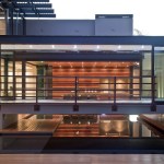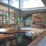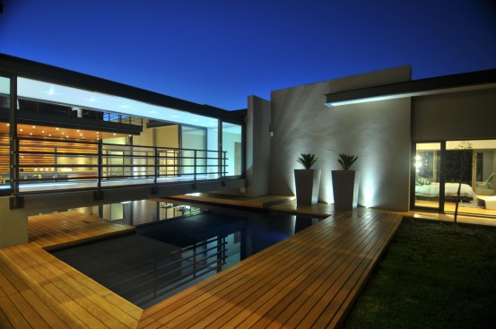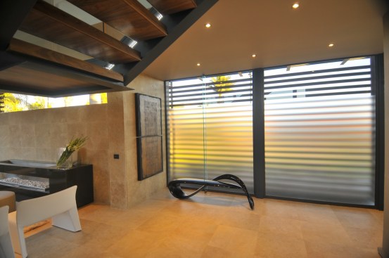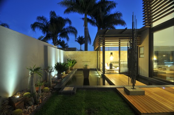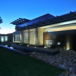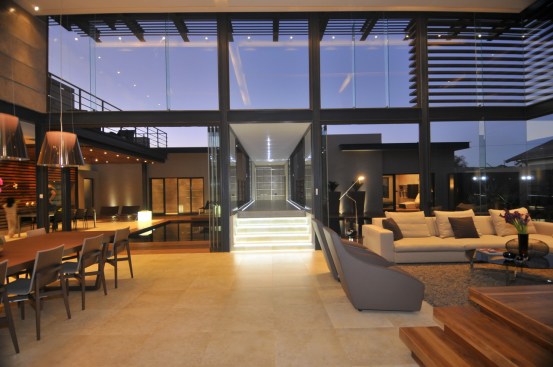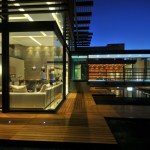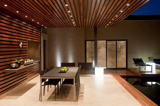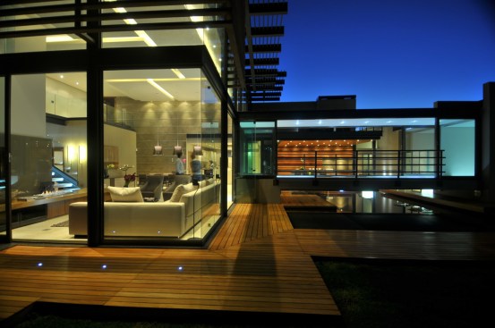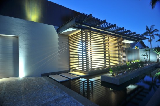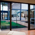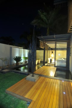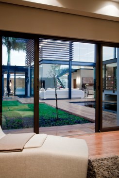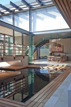 Due to the massive glass walls the house cools down faster in the evening, furthermore this allows the cooling effects of the pool and water features to enter the house.