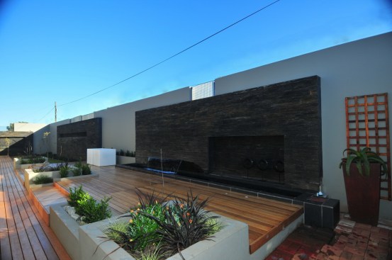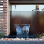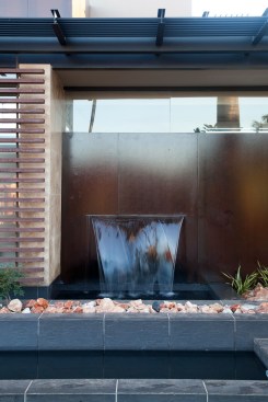 Special attention was paid to the street façade- the water feature and rusted steel create an abstract composition with a steel security screen which opens up to reveal the sandblasted glass front door.