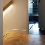 The ground floor is built as a split level with an office and TV room on the dyke level and through a wide staircase you can reach the sitting area with the kitchen, where you have a view of the deep back garden with adjoining terrace.