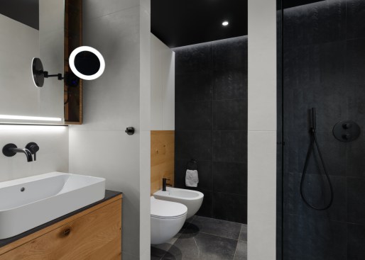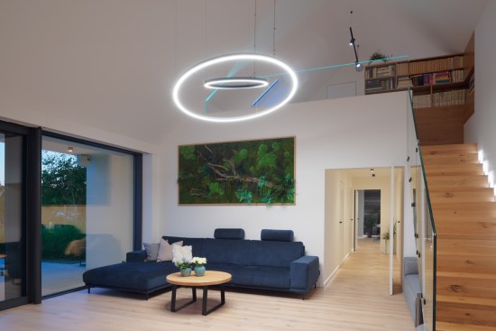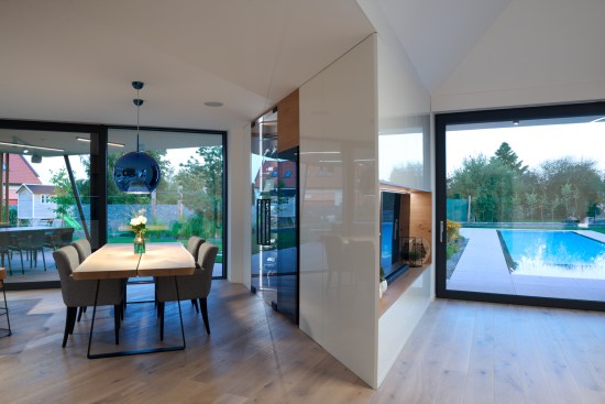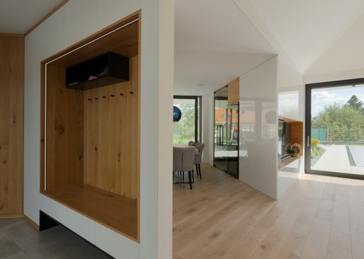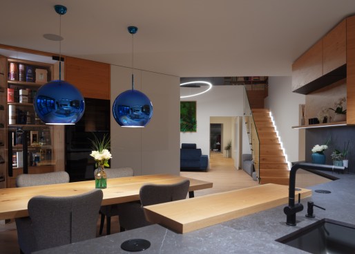 The house has a private terrace with a gazebo in the direction of the pool. An interesting feature is the dressing room together with the wellness-styled bathroom with artificial RGB lighting, which allows one to create the right intimate and relaxing atmosphere. This bathroom can only be entered via the bedroom. However, the RBG lights continue throughout the house, so it is possible to set any light atmosphere in any room, regardless of whether this concerns colour or intensity. The common space is designed to allow both families to spend most of their time there. Thanks to the large windows, they have a big view of the garden. The kitchen features a ceramic cook top that is resistant to both mechanical damage and heat. There is also a wine cooler in the kitchen for up to 100 bottles, including space for storing additional bottles without temperature control and space for glasses. The designers worked with LOXONE smart electrical installations. There isn’t a single switch in the house. The lights operate on the principle of motion sensors, including wireless charging integrated in the kitchen unit – one only needs to place their phone on the kitchen worktop and it begins to charge.