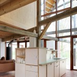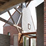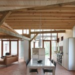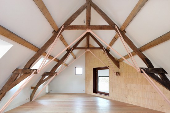 As a correction on the original buildings, the roof beams are cut in some places, to clear space for living. The cut beams are repaired again with steel beams, differently, retaining the original structure in a different configuration.