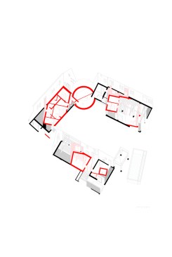 The exact alignment and precise hooking of the position of the various buildings is projected back onto the existing arrangement. In an initial consideration, a strange drawing. In a second look, a particular outcome.