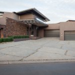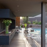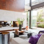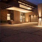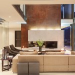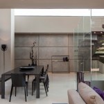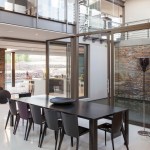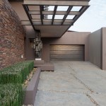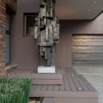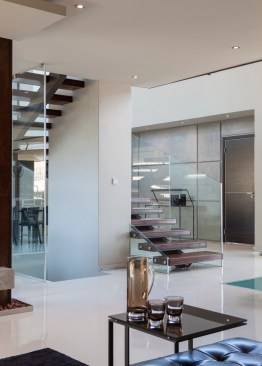 At the glass front door, an interesting contrast is created by the transparency and openness of the home behind the solid entrance walls.
