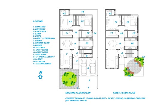 House is designed accordingly, having same design on both floors. Stairs are provided in the lobby so that first floor family uses the house independently without disturbing the family living on ground floor. Car porch can accommodate 2 large and 2 small cars. Ground floor has lawn where as first floor has planters and sitting area in circular form as on round floor.