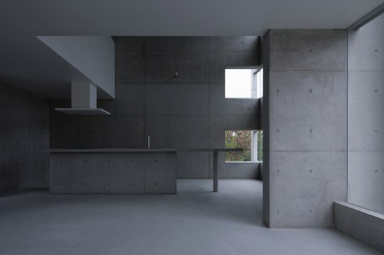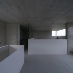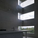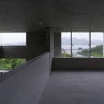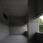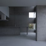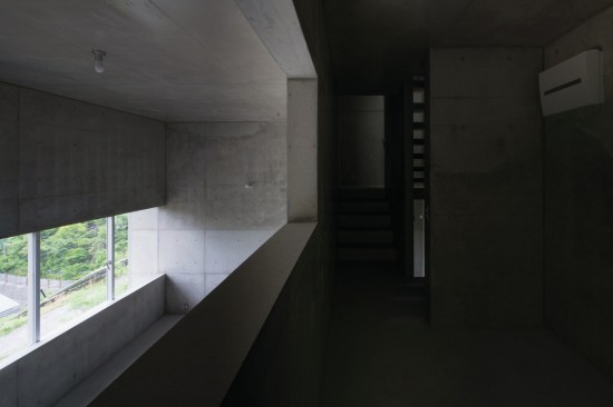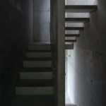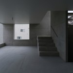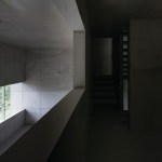 The road level meets the house in its vertical center from the entrance to the first floor, which downs 1,5 stories. Here a room with a high ceiling pops up after walking down the long dark staircase between the walls. Sequences like this that descend underground give us more consciousness about the richness of a tranquil space.