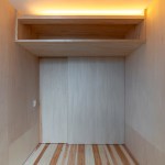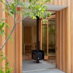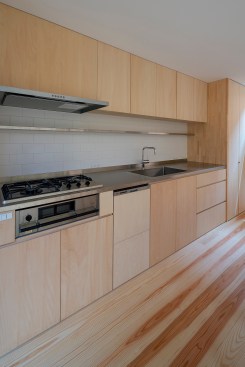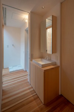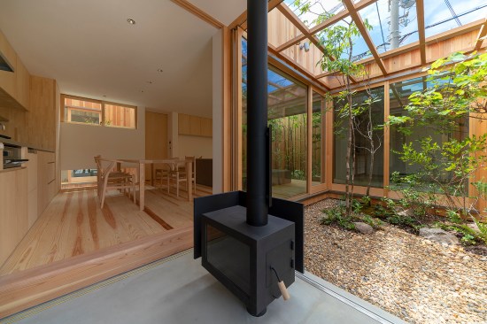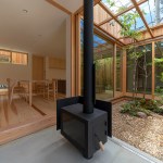 At “dry area”, the placement of windows is well considered, so as to enjoy the scenery of the downward planting, and the change of sky, when family members get together at the table, even though some of the parts obstructs the view from living dining room. In a dirt floor of the entrance, a woodstove is designed. This is because the client wish the children would feel the sound of wood burning in winter, and the design was created by imagining the family gathering that they would cook roast sweet potatoes by encircling the woodstove and enjoy the season.