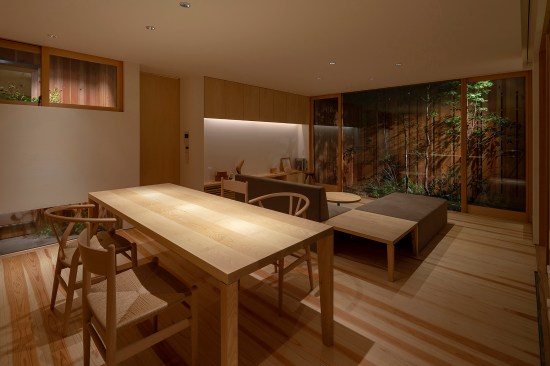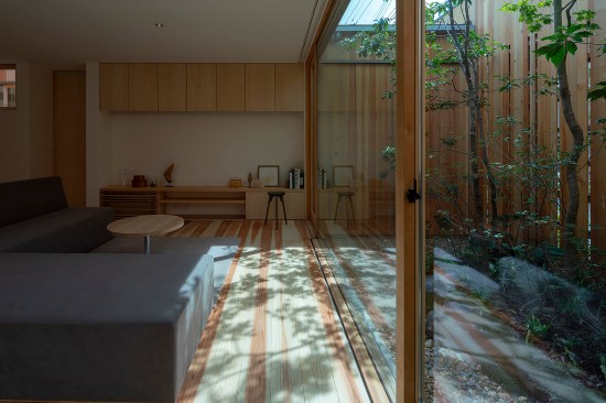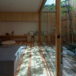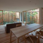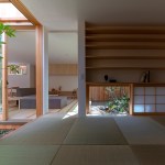 The structure is divided into 3 areas, from the entrance to the back of the house, and each area has a small courtyard where private vegetable garden can be enjoyed. The first of the courtyards has a traditional dirt floor, a Japanese-style room for family which they can use freely, and “a yard with kitchen garden”, in the middle, semi-public living dining space, and “a yard for viewing”, to the back, room for private, and for laundry, “dry area”.