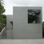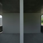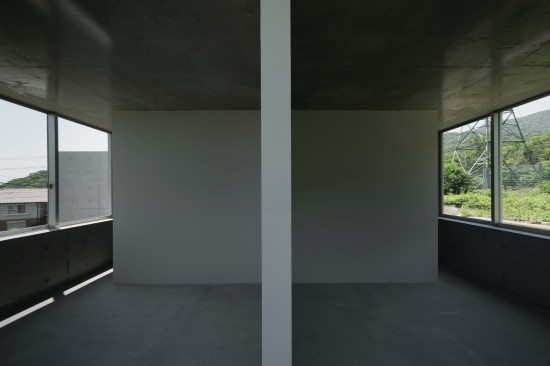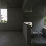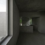Two squares make a constriction in a one-room space. The first floor is divided to make different recesses in the house. On the second floor, a cross-wall divides the square. A spiral staircase is placed in the core center of the house to connect the three spaces.
