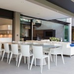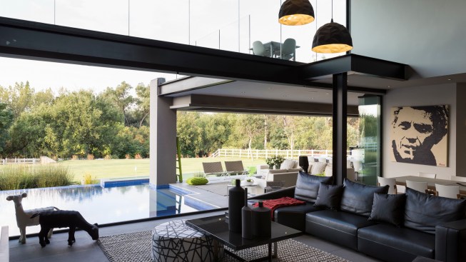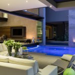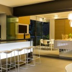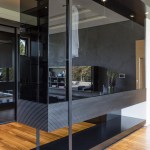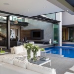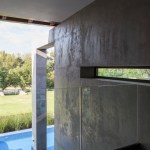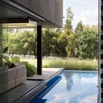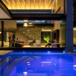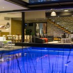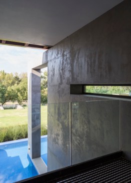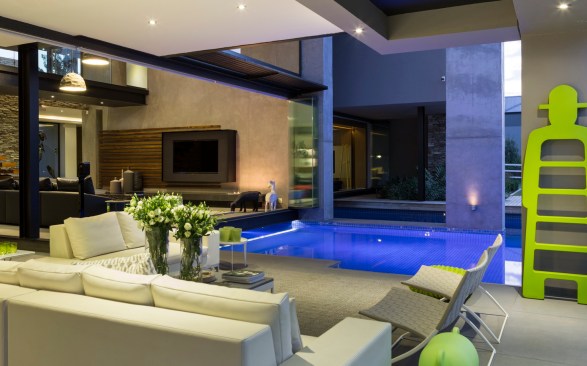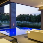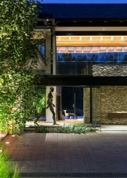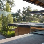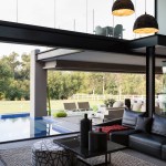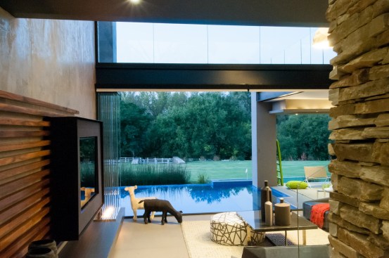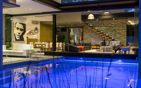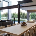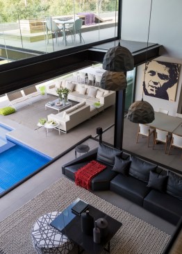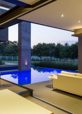 The spacious lanai accommodates a braai, bar and seating area making it ideal for entertaining while the swimming pool is integral to the design of the lanai and extends beneath the cantilevered floor slabs. The floating roof rests on a wall of glass while the slightly elevated lanai encourages landscaped terraces to connect the house to the countryside.