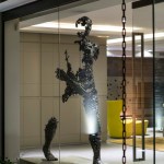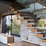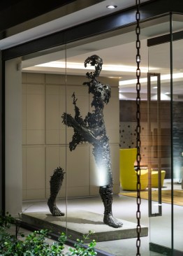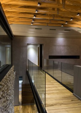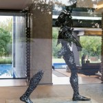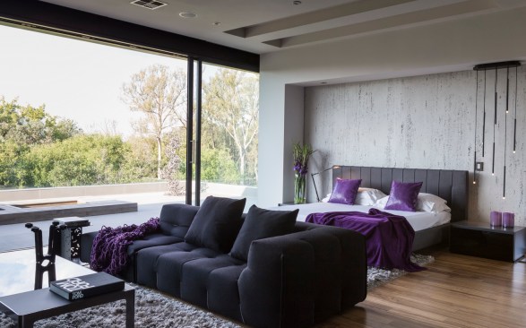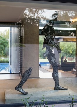 The floating timber staircase becomes a grand feature which floats above the floor plane as the natural stone cladded wall forms the perfect frame for the sculptural masterpiece by Regardt van der Meulen. A bridge with glass balustrade connects the two wings of the house while also maintaining a sense of privacy for the main bedroom which is located on the eastern wing of the house.