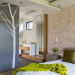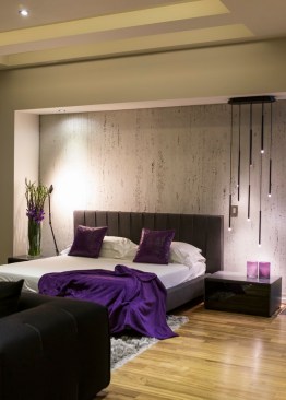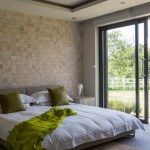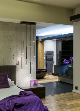 The design of the main bedroom incorporates a private lounge and a discreetly screened walk in dressing room. The tinted glass screen offers privacy for the dressing room thus adding an element of luxury with its high gloss finish. The suite flows onto a large private balcony with magnificent views of the paddocks and surrounds. The bed is perfectly positioned in a recessed niche lined with textured wallpaper creating an intimate setting.