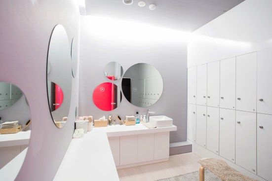 The color of the overall space is white, but red (the representative color of this fitness studio) gave points to the entrance and the entrance of the locker room. Space was made to reflect the direction of the Pilates studio. The sign design was also designed with the CI circle as the motif, and the circular mirror in the dressing room and the circular sheet in front of the entrance are the same. Like this, from spatial design to CI, it is necessary to have the consistency of design and color like one package.