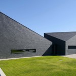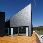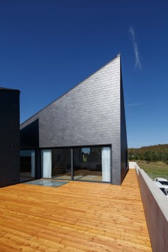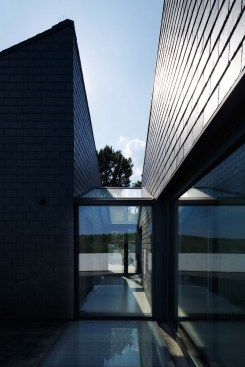 From the street we can see single-story building with garage and glass foyer in-between. This characteristic body of the buildings are made by low wall and the sloping roof, and they are covered totally with slate. Concrete fence wall marks platform with building, entrance area, driveway and wooden terrace suspended over the ground.