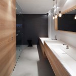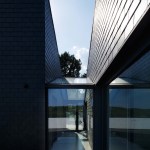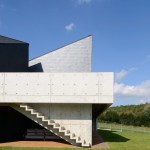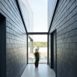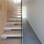 Bedrooms are located downstairs. This part of the building is partially covered by ground and invisible from the street. Under the upper terrace, at the ground level is second, is a fully covered terrace. Exterior cantilevered stairs link both terraces.