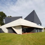 The surrounding landscape interested us more than unexciting development context. Hilly area and forest in the background has become a main point of reference. The building fits to existing topography and coincides with the landscape. The house is open towards the most interesting views and separate from the nearest buildings.