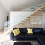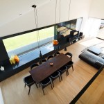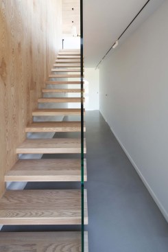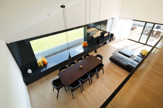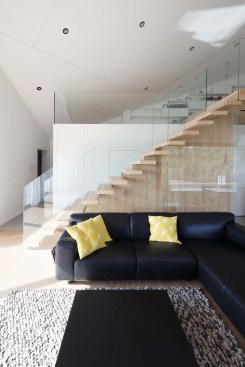 In interiors, white surfaces of walls and slanted ceiling are complemented by glass, polished concrete and natural wood floors, wooden stairs and dark accessories. On the top level there is an open living room. Pantry, study room, toilet and kitchen are hidden in white cuboid. Above cuboid there is a mezzanine with bookcase. Wooden stairs are a conspicuous part of the living room.