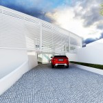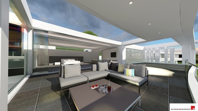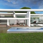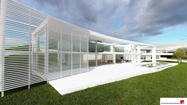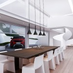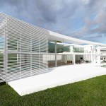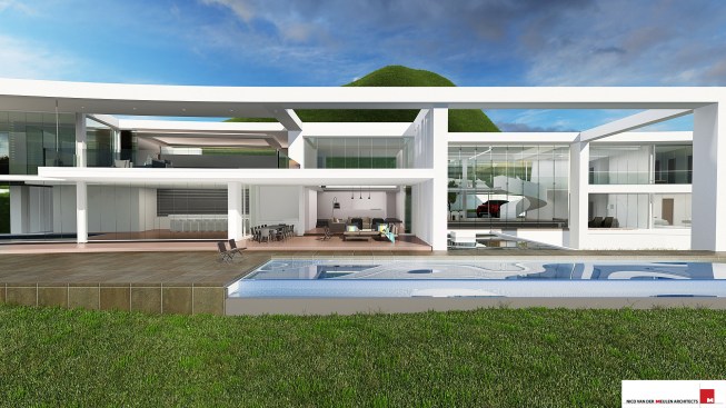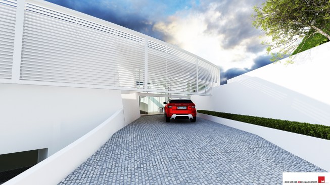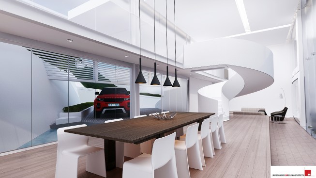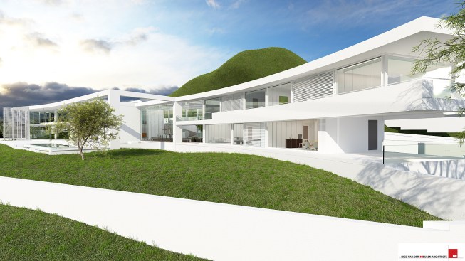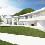 The concept of a contemporary white building that follows a gentle curve came about after the original complicated design was simplified and reduced into a white curve mirroring the curve of the hill base. The basement includes a garage that can fit a maximum of 6 cars inside, and staff quarters that include four bedrooms and two bathrooms.