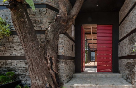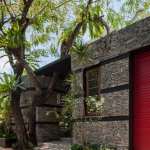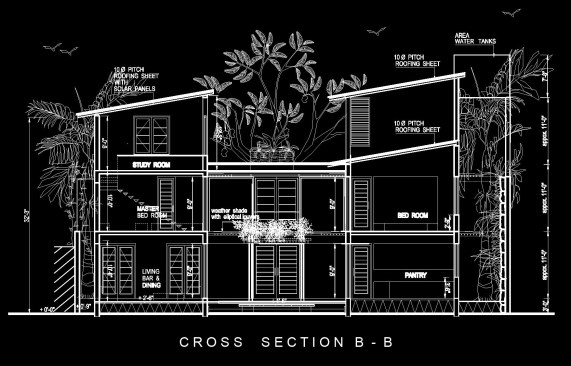 Suns Ray’s & Power is ” Extensively ” used to Save Energy & to Cast a Magical Shadow & Reflections off the series of Irregular Pergola Beams along the raised entrance walkway and sunshades in and around the House creating an Unbelievable Rhythm !