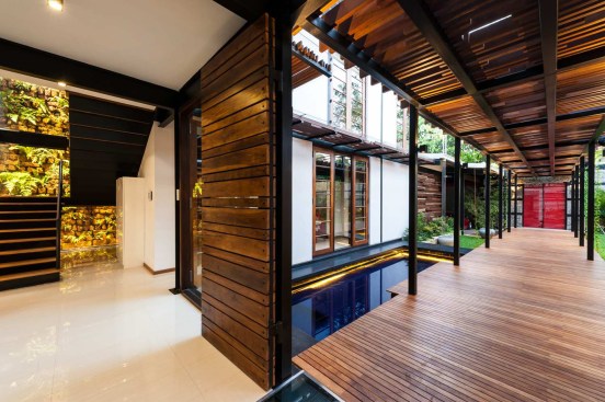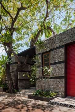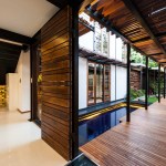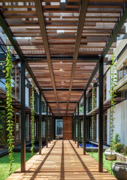 An ‘ Irregular Timber Pergola ‘ that runs over the Walkway and as a sunshade around the House creates a marvelous ” Rhythm ” , under the Tropical Sun , throwing unbelievable Shadows & Reflections, on the ground ! A dainty creeper containing cascades of ‘Yellow Blossoms’ winds up the slender black steel columns along the Walkway providing the necessary shading.