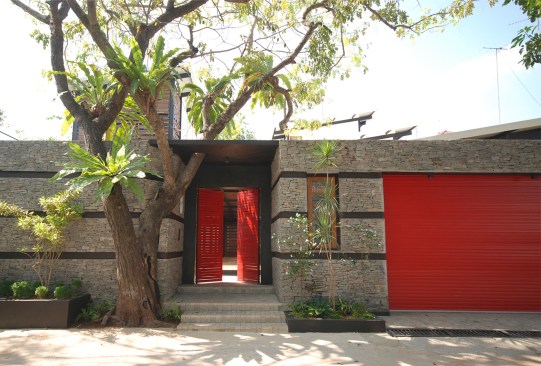 ” RED ” was used on the Entry Door & on the Garage a Door to Contrast & Compliment the predominance of Grey horizontally cut joint less Granite Wall with 5 ” reliefs of Titanium of a Darker Tone, against the cascading Yellow Blossoms . ” RED ” also gives ” No 8 ” a distinct identity in the environs !