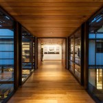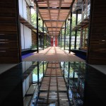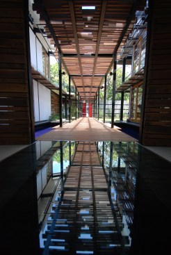 A raised Timber boarded ” Walkway ” runs along the central spine connecting the Red Slatted Entrance Door with the Door of the Main Entrance at the Link over an expanse of Structural Glass creating “ Magical Reflections ” , upon entry .