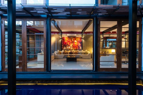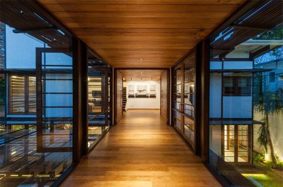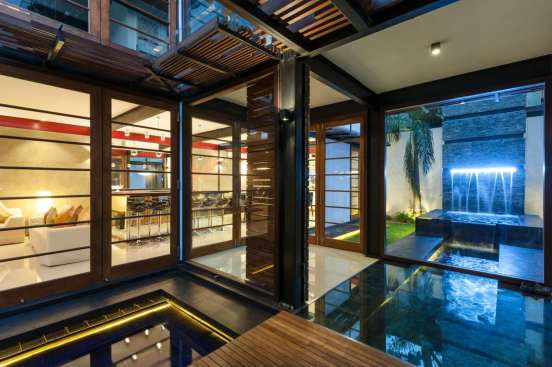 ” No : 8 ” is designed as 2 Pavilions , on the East & West , connected by a Structural Glass Link under which of a Ultramarine Blue Reflecting Pool flows . The Pavilions , are enclosed in Glass , giving the house , the necessary permeability it needs to merge the “Outside into the Inside” and visa versa .