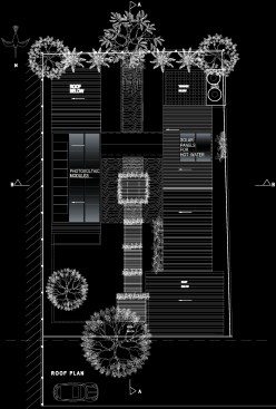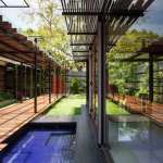 In ‘ Orientation ‘ it faces North : South direction reducing heat gain . As for ‘ Ventilation ‘,all rooms are designed to have through ventilation . Maximum advantage of ‘ Natural Day Light ‘ is exploited throughout with the use of Large Doors & Windows using Low E Glass to minimize Heat Gain , while White High Gloss Tiled Floors also help to reflect light , maximizing Day Light . The East facing Single Pitched Roofs help to carry 28 nos of Solar Photovoltaic Modules to generate around 800 kwh of ‘Electricity’ thus feeding excess into the National Grid . ‘ Hot Water ‘ is also provided via a series of Solar Panels . ‘ LED Lamps ‘ is used though out the House , to have minimal impact on Electrical consumption while ‘ Intelligent Home Automation System ‘ provides Lighting Control on the touch of a I Pad , thus saving unnecessary usage of Electricity . Independent ‘ Inverter Air Conditioning Units ‘ are used in Individual rooms , to give flexibility & efficiency since only 2 inmates occupy the house . The Structural Elements in this House is Designed to be in Steel , which is a Recyclable Material The Double Steel Sandwich Panel Roof , uses 2″ Polystyrene Insulation against Heat gain & Noise Pollution. White has been chosen as the Roof Colour , to minimize on Radiant Heat . Rain Water is Harvested in the Blue Reflecting Pool, for the Garden . Commercial Timber imported from Malaysia is used on Sun Shades . Recycled Laterite is used on the ‘ Live Walls ‘.