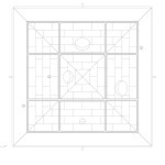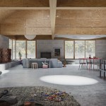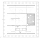 There are second-level annex spaces, but these are ancillary to the plan, comprising a lofted bedroom over the first-floor bathrooms and a netted rumpus space strewn with pillows (presumably for the use of the client’s small children) strung over the lounge area. The most striking feature of the scheme is the ceiling: fashioned of plywood, it expresses the grid in a series of deep rectilinear coffers, pitched at the sides under the angle of the gabled roof and pierced from place to place by skylights that cast pools of sunshine on the floor below.