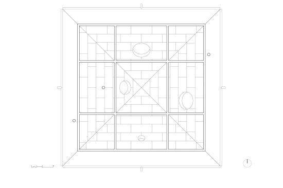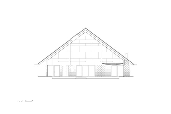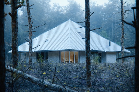 Set on a 25-acre site, the 2,300-square-foot house has a material palette restricted to cinder blocks, concrete, and plywood laminate. A modest budget made economy essential, and a straightforward parti ensured that the structure could be delivered with relative ease: The primary floor is divided into a nine-square grid, with symmetrical fenestration and only a few enclosed rooms.