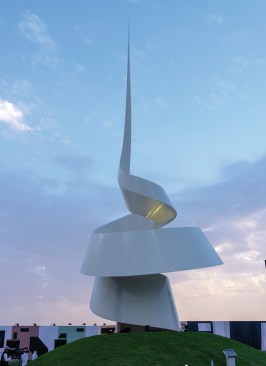 Using a form of geometry called ‘developable surface’, the curved shell was created from rolled steel plates, cut by lasers guided by computer control, welded together and painted with multiple layers to protect the steel from sandstorms and weather erosion.