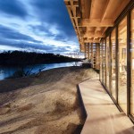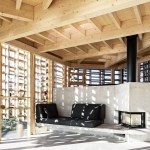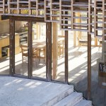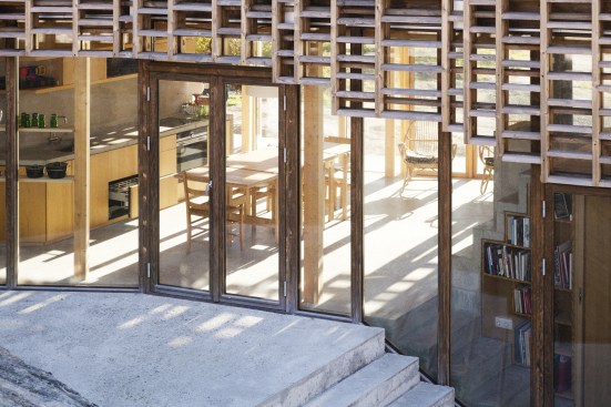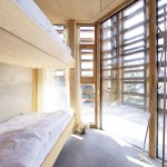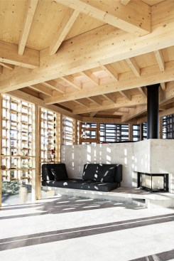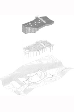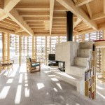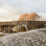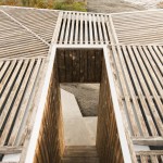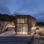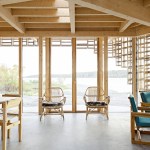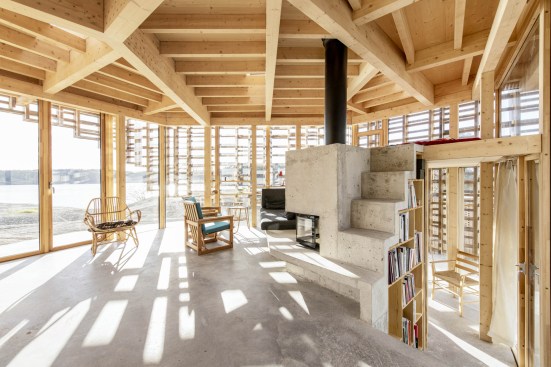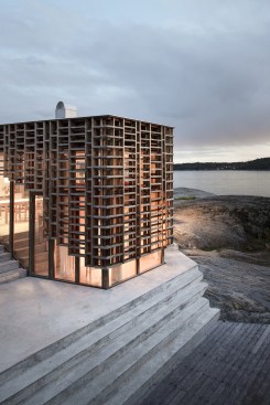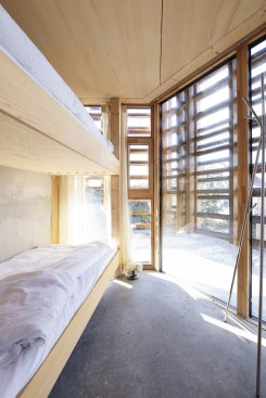 A prefabricated timber structure is placed on the concrete floors and at last a light wood structure covers the cabin to filter the light and direct the views. The wood structure has a depth that creates a play of shadows through the day and a calm atmosphere resembling the feeling of sitting under a tree.