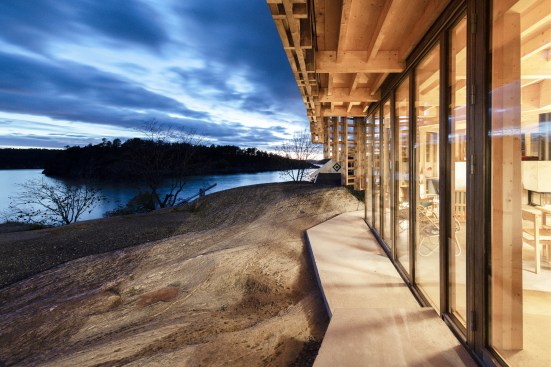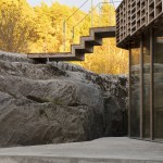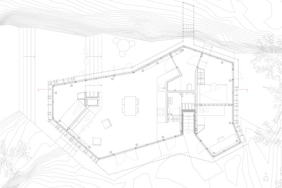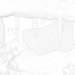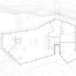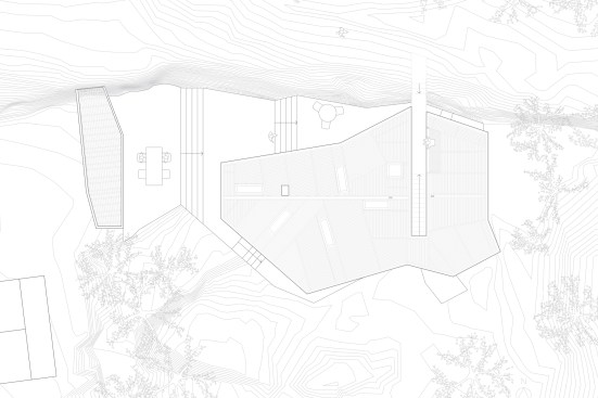 The topography of the site was carefully measured to integrate the rocks into the project. Concrete floors in different levels connect to the main levels of the topography and create a variety of different outdoor spaces. The concrete floors and stairs dissolve the division of inside and outside. The interior becomes part of the landscape and walking in and around the cabin gives a unique experience, where the different qualities from the site becomes part of the architecture. From the concrete floors kitchen, bathroom and fireplace grows up to serve the inhabitants like furniture’s that sits on the rock.
