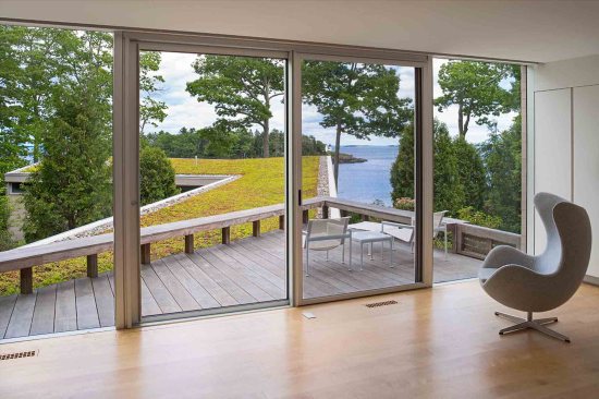 The house itself is divided into three intersecting volumes; each has a unique relationship to the ground and surrounding landscape. A lap pool, embedded longitudinally into the hillside, connects the upper guest house to the lower main house. The Z-shape arrangement of the volumes strategically shields direct views from the street and the neighboring properties, while framing the desirable views to the east; the harbor, island, and ocean reveal themselves slowly as one descends the sloping site through the house