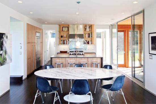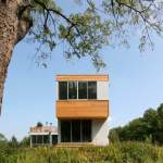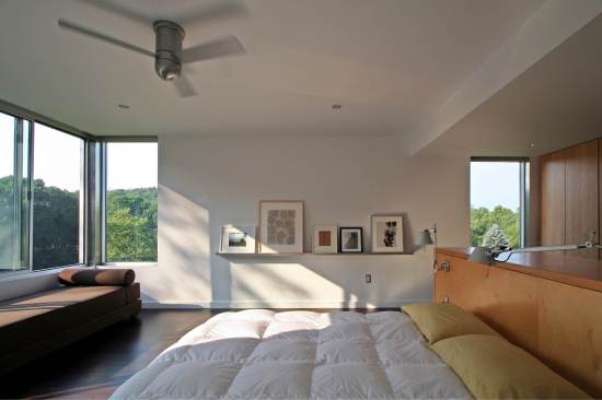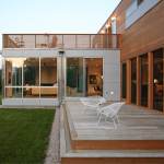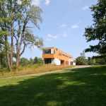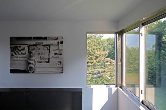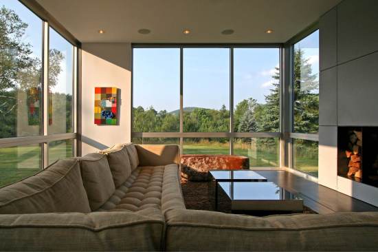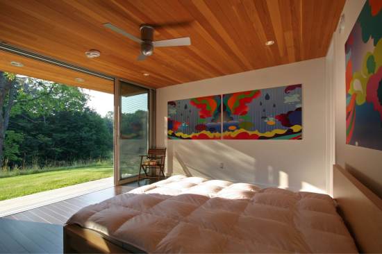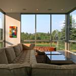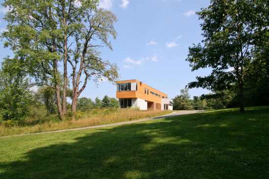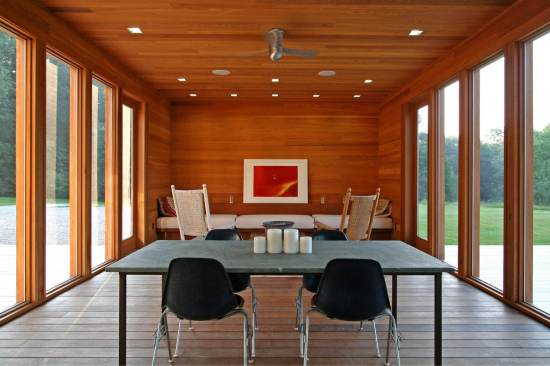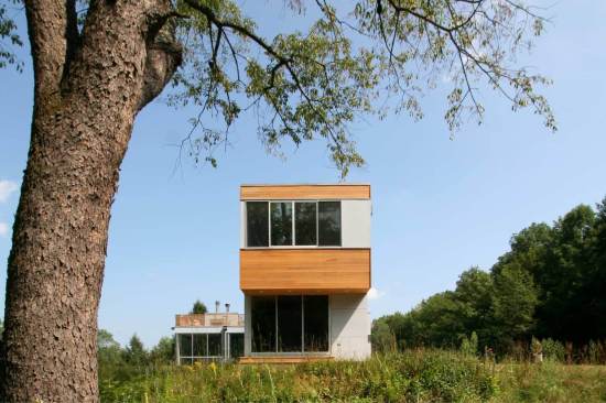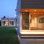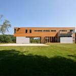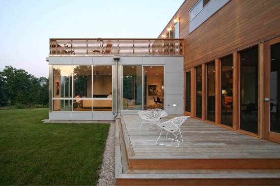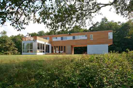 Perched on a hill just outside the town of Norfolk, Connecticut this prefab home serves as a weekend getaway for a family of four wishing to escape their hectic lives in New York City. Just three hours north of the city, the home features floor to ceiling aluminum clad windows to maximize daylight and to provide sweeping views of the countryside beyond. Programmatically, the home is divided into two bars; the first floor bar contains the public sector of the home for living, cooking, dining, and entertaining, while the second floor contains the private sector, mainly bedrooms & baths. Both floors blur the boundary between interior and exterior and provide ample views for enjoying the beautiful scenery. The main living area is wrapped in floor to ceiling glass and features a fireplace for cozy winter days. Connected by one of many exterior decks is a screen porch big enough for outdoor dining and living during warm summer nights. On the second floor, an exterior deck is located adjacent to the media room, which also doubles as an office. This roof deck features an outdoor fireplace as a multi-season entertainment space with stunning views of the surrounding landscape. The house also contains a private guest suite. The guest suite is secluded from the rest of the house, yet still connected to the landscape with large sliding glass doors and its own private deck. The home is comprised of six modules utilizing the efficiencies of offsite factory construction. It employs several sustainable features such as bio-based spray foam insulation, a 98% energy efficient boiler, low-flow plumbing fixtures, LED lighting, FSC-certified ipe & cedar, recycled cement board panels, bamboo floors, radiant floor heat, energy star appliances, and a green roof.