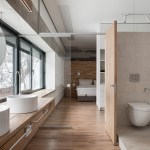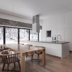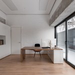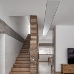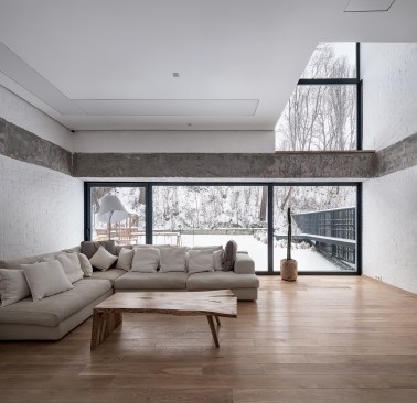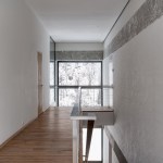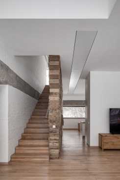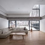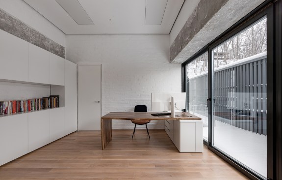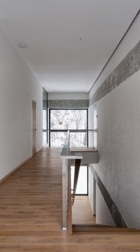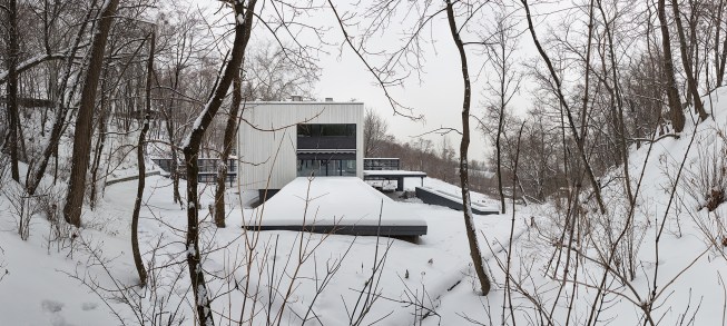 Living room is separated from kitchen/dining-room and is visually isolated from the active zone of the plot. Located in the cantilevered part of the volume, the living room is immersed into the garden without touching it. Children’s bedrooms are separated from master bedroom by means of a stairсase which overlooks the city and has a two-coloured space overlooking the garden. Master bathroom looks south-east. The study and the guestroom have their own terrace linked to the lounge zone. The railing on this terrace serves as a visual border which separates the study and the whole plot from its north-western neighbours. The usage of one and the same material unifies all elements of the house into one single structure which merges with the natural landscape and marks the borderline of the living space. The aim of the project is to create an environment where the house itself might help its dwellers perceive the surrounding, slopes of the hill in particular, as natural protective walls and natural greenery – as a wallpaper pattern which changes over seasons.