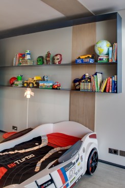 The M Square Lifestyle Design team set out to create a warm, practical family environment which echoes the architectural vision of the house. The objective was to not only capture the light created by the high level windows but also to craft an interior canvas that would not compete with the shadows created by the louvered exterior facades. This was achieved by using long linear elements which visually connect spaces and simultaneously conceal various facilities and functions that could otherwise overcrowd the room.