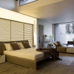 The design of the main bedroom incorporates a private lounge area as well as an en suite bathroom. These are discreetly screened between the walk in cupboard and the steel louvered screen that ensures privacy from the garden is maintained.