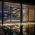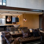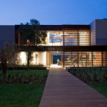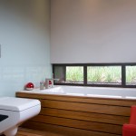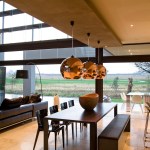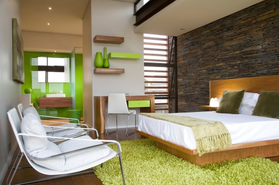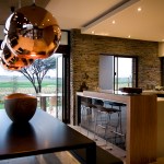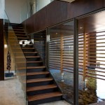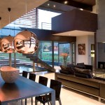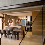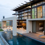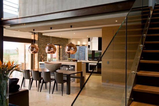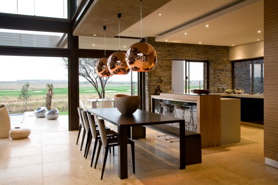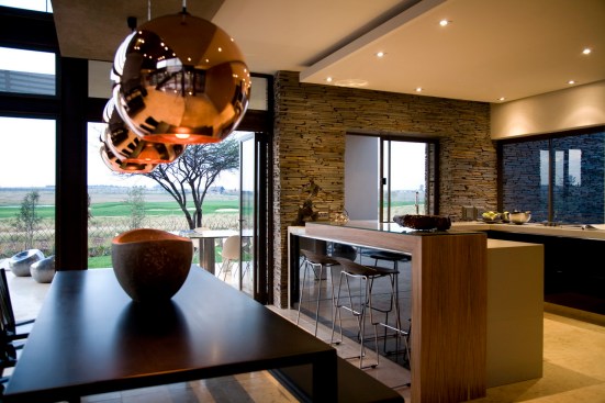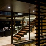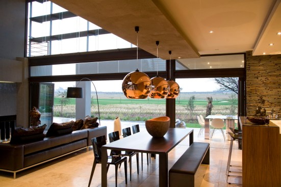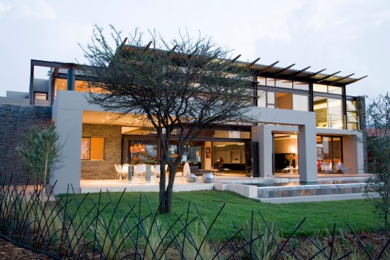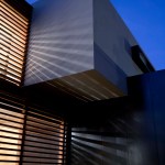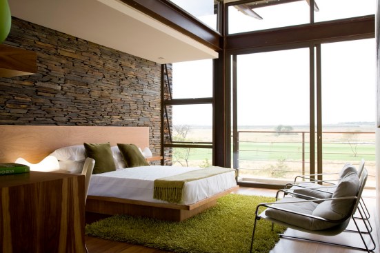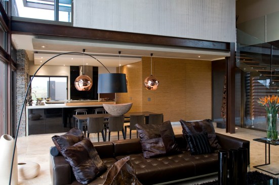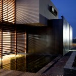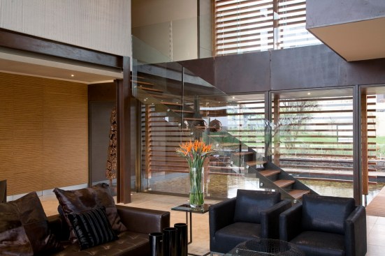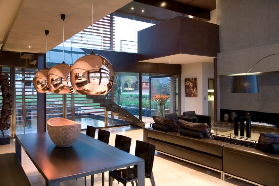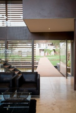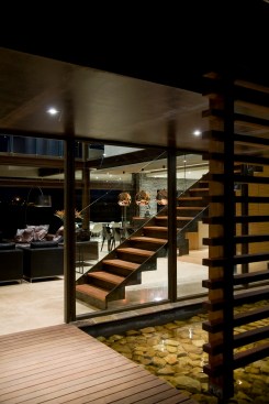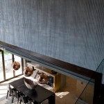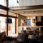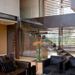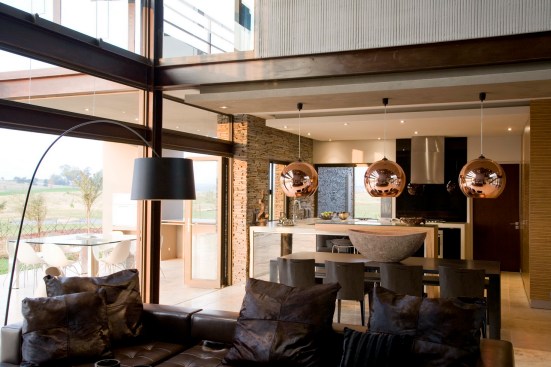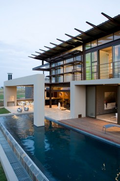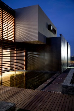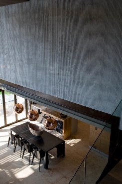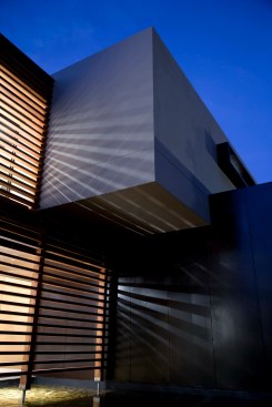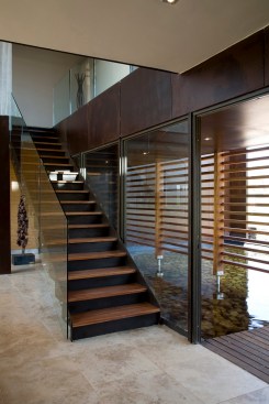 The home combines the use of rock, steel, wood and glass – classic modernist design elements re-mixed for new applications. The idea was to create a luxury family home with an ecologically sound design that maximizes indoor-outdoor living. The street front of the south entry home features a large rusted-steel-clad wall, cleverly mounted on tracks so that it slides back to reveal the double garage.