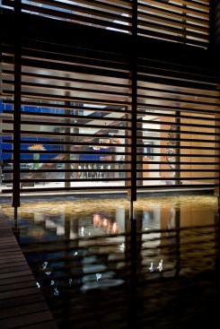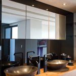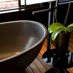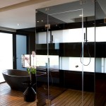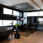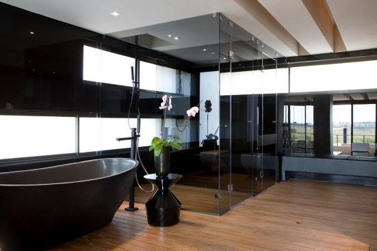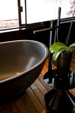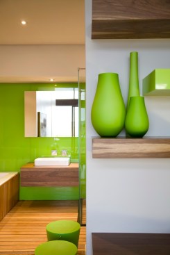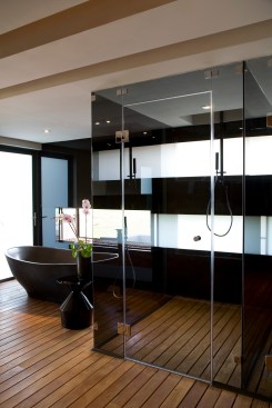 Balau was used for the deck walkway from the street to the front door, which passes over a Koi pond at the front of the house. The master bathroom also has Balau timber floor decking so when the glass doors are slid back onto the terrace, the spaces are integrated.Tiles were avoided in the bathrooms and back-sprayed glass was used instead.