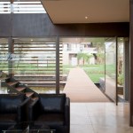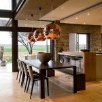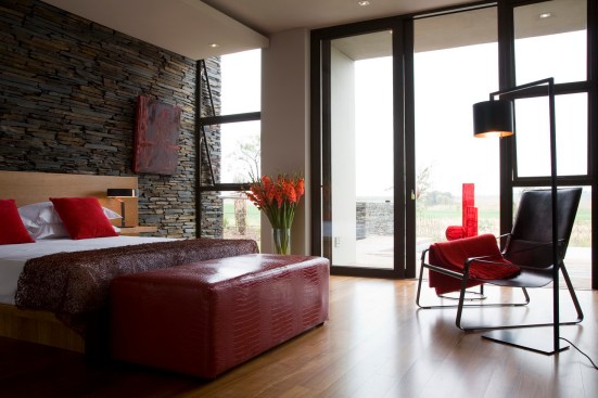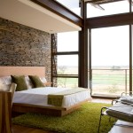 Part of the design is a two-foot-thick, stone-clad western wall serving as a heat absorber, making the home ecologically smart and functional. Furthermore the windows of this residence are recessed, with brise soleil that are strategically cantilevered to absorb the sun during the winter months, while blocking it in the summer.
