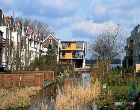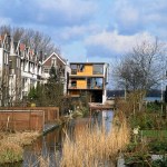 A composition of small, flexible rooms in the house suits the family’s needs. These rooms are mostly open, resulting in one continuous space. A private studio space on the ground floor opens onto a serene Japanese garden.The lively first floor, with the kitchen and living room, overlooks the Kralingse Plas. In the adjacent building, the open layout features a spacious bedroom and workspace. The two houses are connected on the ground and second floors.