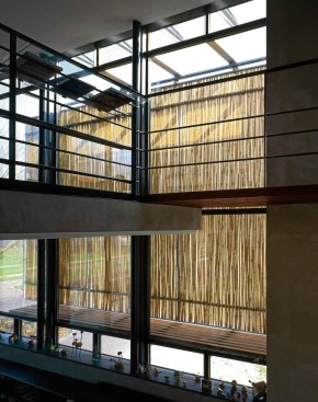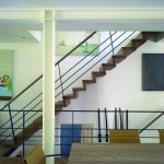 Diverse materials such as stone, concrete, glass, steel and various types of wood lend the house a range of atmospheres from openness to intimacy. Contrasting elements – hard and soft, modest and luxurious – enhance each other, while inside and outside merge freely. A metal and timber stairs joins the first floor with the upstairs gallery-library.