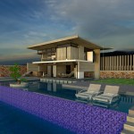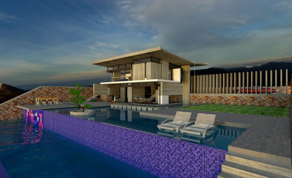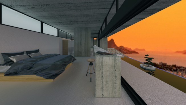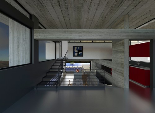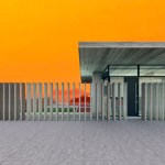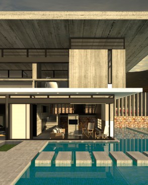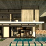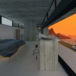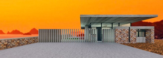 – Step 1: A roof is introduced as the archetypal element to define a residence. Both the roof and its pillars remain in their primary state (exposed concrete), so as to clearly demonstrate their symbolic function, in contrast to all other finished elements of the residence. The V-section shape of the “butterfly roof” makes it resemble to an eye wide open to the through views.