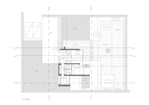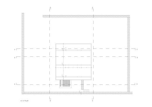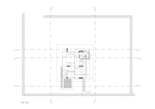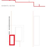 – Step 3: A stone farmhouse, reproduced at a rectangular plan (3,80m x 7,40m), slides along the upper terrace of the dwelling, under the V-section roof. This cubic core symbolically contains just the very primary uses one would meet in the traditional family: a bedroom, a bathroom and a kitchen.