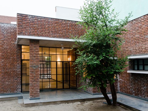 Built at a budget of less than $18 per square foot within a timeframe of 6 months, the house establishes itself as a prototype of low-cost, sustainable urban housing, to ensure a pragmatic shift in the overall approach to design and construction strategies. The building is constructed primarily in exposed brick and concrete, lowering its cost of construction considerably, while allowing for endurance and material expression. Additionally, the cost of the metal frames in the windows is much lower as compared to typically used wooden frames that need to be coupled with additional grills for safety. Light grey, locally available Kota stone is used for the flooring that complements the overall aesthetic of the house. LED lighting and low-flow faucets enhance the energy efficiency of the building, as does the overall plan, designed to minimise heat gain in summers, while providing adequate levels of daylighting. Soft paved surfaces around the house allow for ground water recharging and reduce reflective glare into the building. Additionally, reflective tiles on the roof are expected to reduce the heat load, and the exposed concrete ceiling in the interiors will not need any repainting.