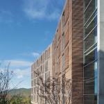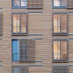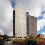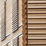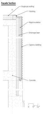 Striating the façade with strips of cypress, Rose materially aligns the dorm to the wooded site rather than to the brick seminary; the building reads from a distance as wood against the woods. Manually operated sliding window screens allow guests to modify their views and sun exposure, and the randomness animates the façade.