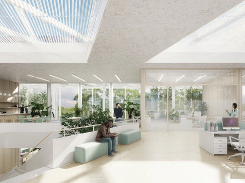 With its winning proposal for the future home of the Houston Endowment—one of the largest grant-making organizations in the Southwest—Los Angeles firm Kevin Daly Architects and Mexico City firm Productora allow the over-80-year-old nonprofit to move out of rented offices for the first time. The new headquarters will occupy a prominent site inside historic Houston’s Spotts Park, a scenic yet central locale that inspired a design that feels equal parts organic and urbane. Key to the scheme is an enormous, semi-freestanding canopy that shelters the entire complex. Supported by columns, the white metal awning is topped by raked louvers with embedded photovoltaics that both screen the harsh Texas sun and harness its energy, substantially reducing the building’s net carbon output. Tucked beneath the vast superstructure, the offices occupy a sequence of boxy volumes faced in glass and white steel, partially framed in structural wooden panels that further enhance the building’s sustainable bona fides. Within the airy interior, employees can move from meeting rooms to event spaces by way of light-filled, spacious corridors, continuing to landscaped grounds that make the building feel like a natural extension of the existing public space.