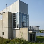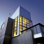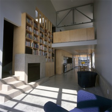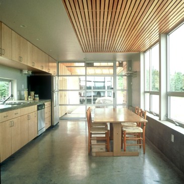 The monolithic, monopitch roof climbs to the south and the water covering one continuous, unobstructed living space progressing from garage, to entry court, to kitchen, living and cantilevered deck. This tube is punctuated by totemic elements which inflect it and provide comfort and place-making (bridge, well, hearth, truss, south window). The spatial reading of the concrete foundation makes a wainscoting sill in the main living area. Three bedrooms occupy the lower level, while a master bedroom/study occupies a second floor loft. De-laminated walls and ceiling expose conventional platform framing. The house exploits a passive environmental approach to heating and ventilation. It is an essay on the relationship between form and lifestyle which clearly demonstrates that a 12’ wide wall in the landscape can provide the spatial and functional requirements of modern living.